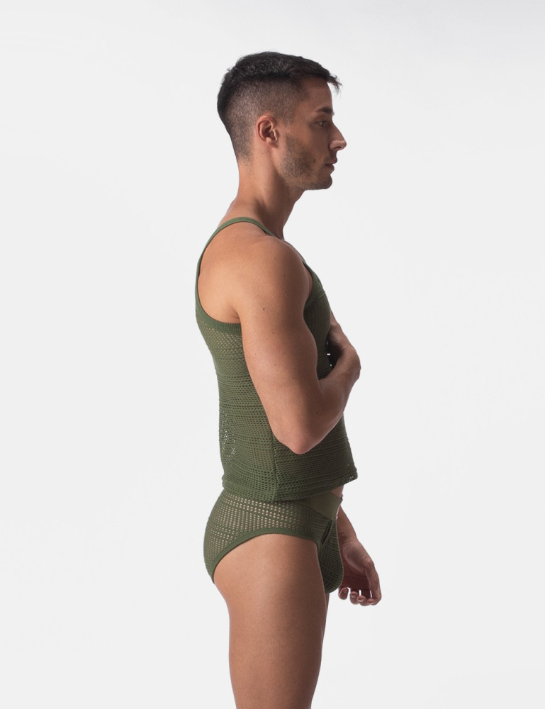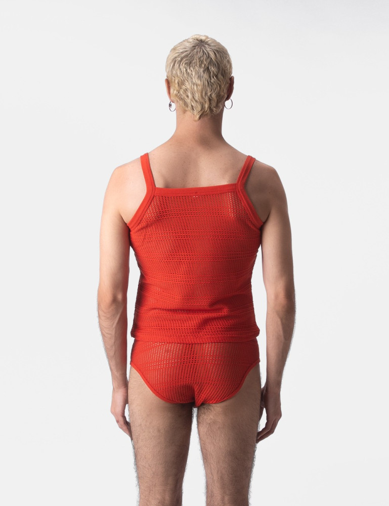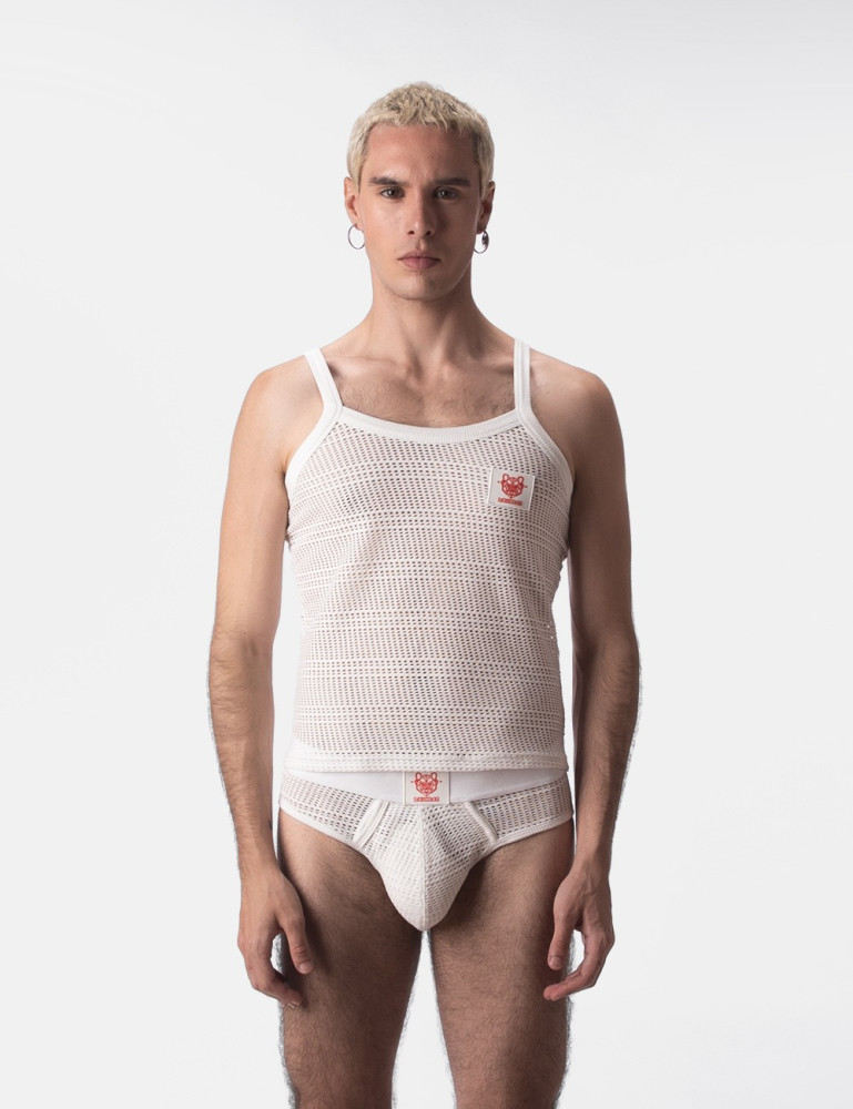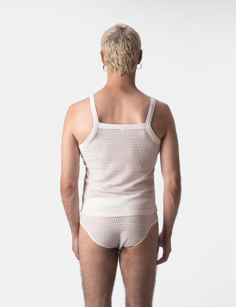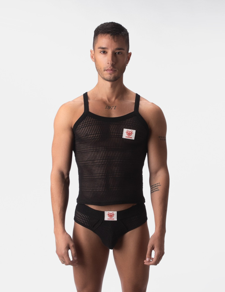 Vékony szabású felsőrész vékony pántokkal, félig átmenő hálóból.