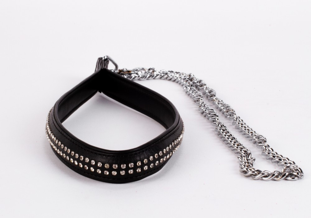 Nyakra helyezhető erotikus fetish játék és egy hozzá tartozó póráz, 2 sor strasszal díszítve. A lánc hossza 34 cm.